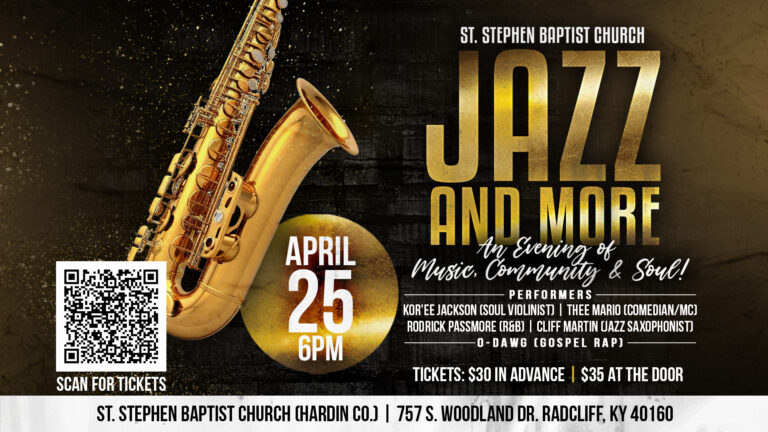 Experience an unforgettable evening of music, community, and soul at Jazz and More on April 25 at 6:00 p.m. Hosted at St. Stephen Baptist Church Hardin County Campus, this event will feature live jazz performances in a vibrant and welcoming atmosphere. Tickets are $30 in advance and $35 at the door. Join us for a night of great music and fellowship.